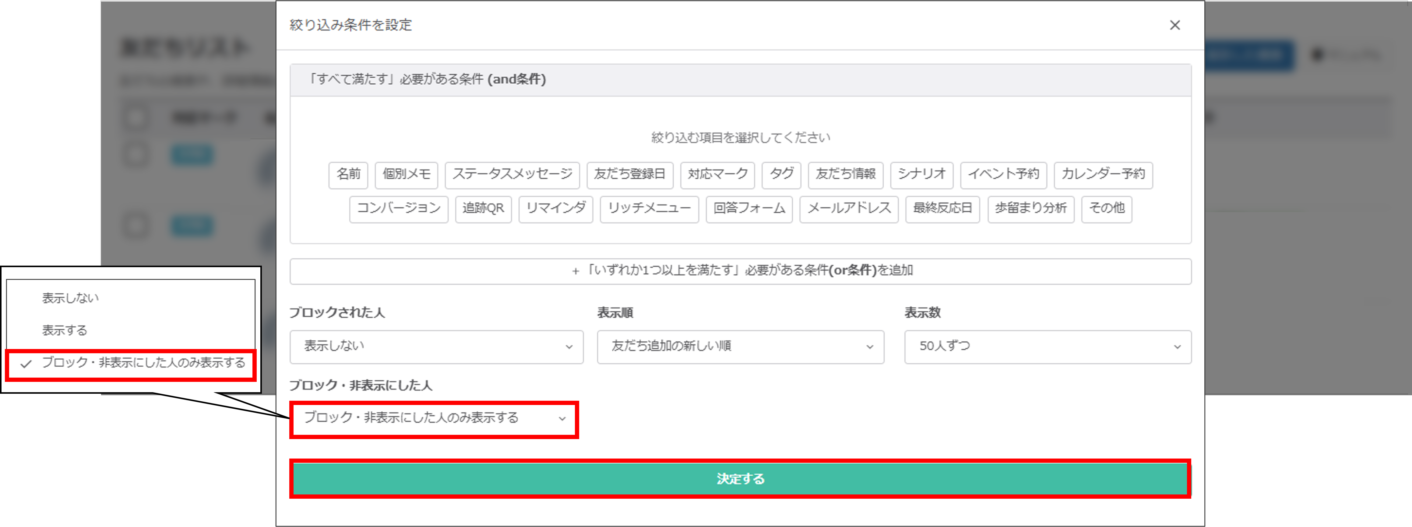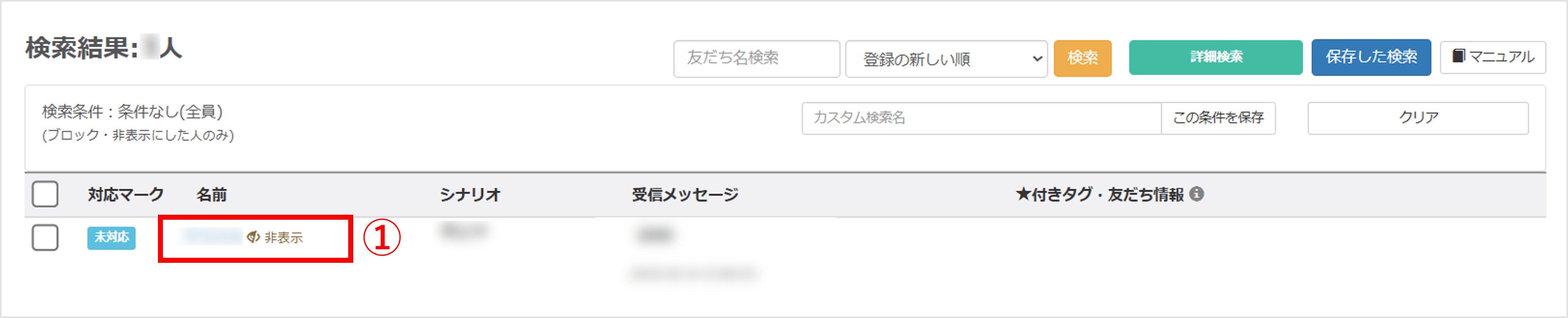 ★名前やタグなどの検索条件を指定せずに検索する場合は、【ブロック・非表示にした人】で「ブロック・非表示にした人のみ表示する」を選択して〔決定する〕ボタンをクリックします。