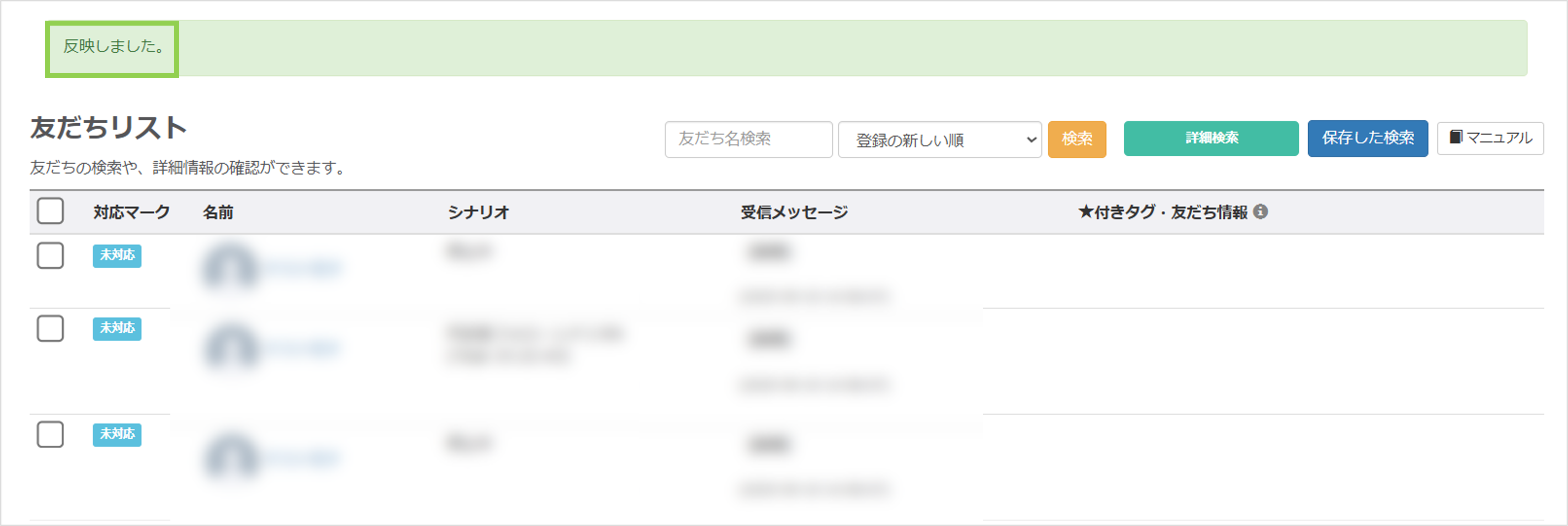 ブロック設定が完了すると友だちリストに画面が切り替わり、「反映しました。」のメッセージが表示されます。