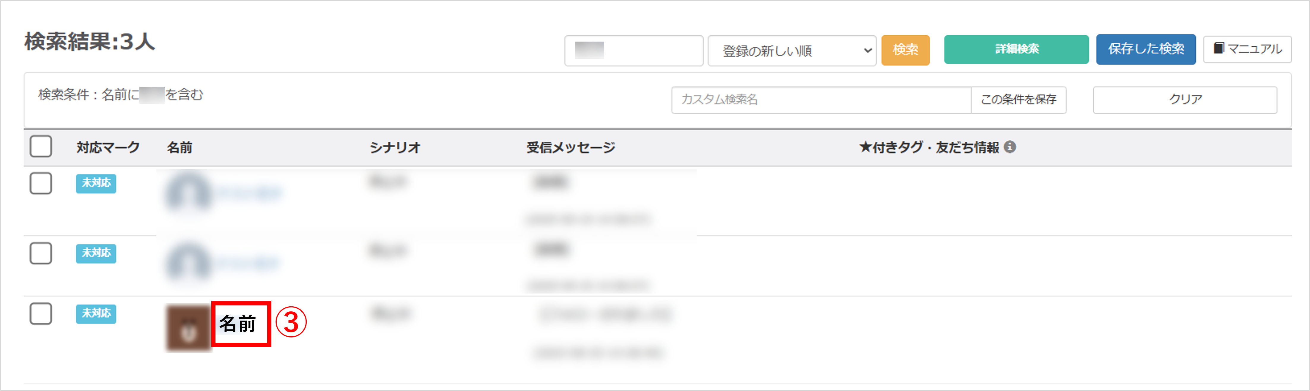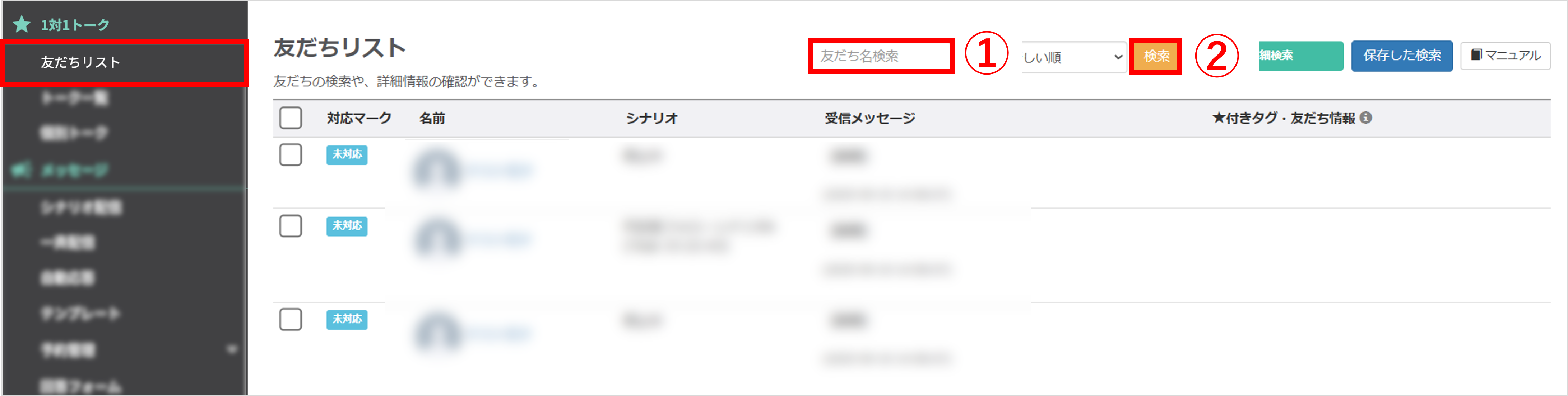 ①『友だち名検索』の検索窓に友だちの名前を入力します。