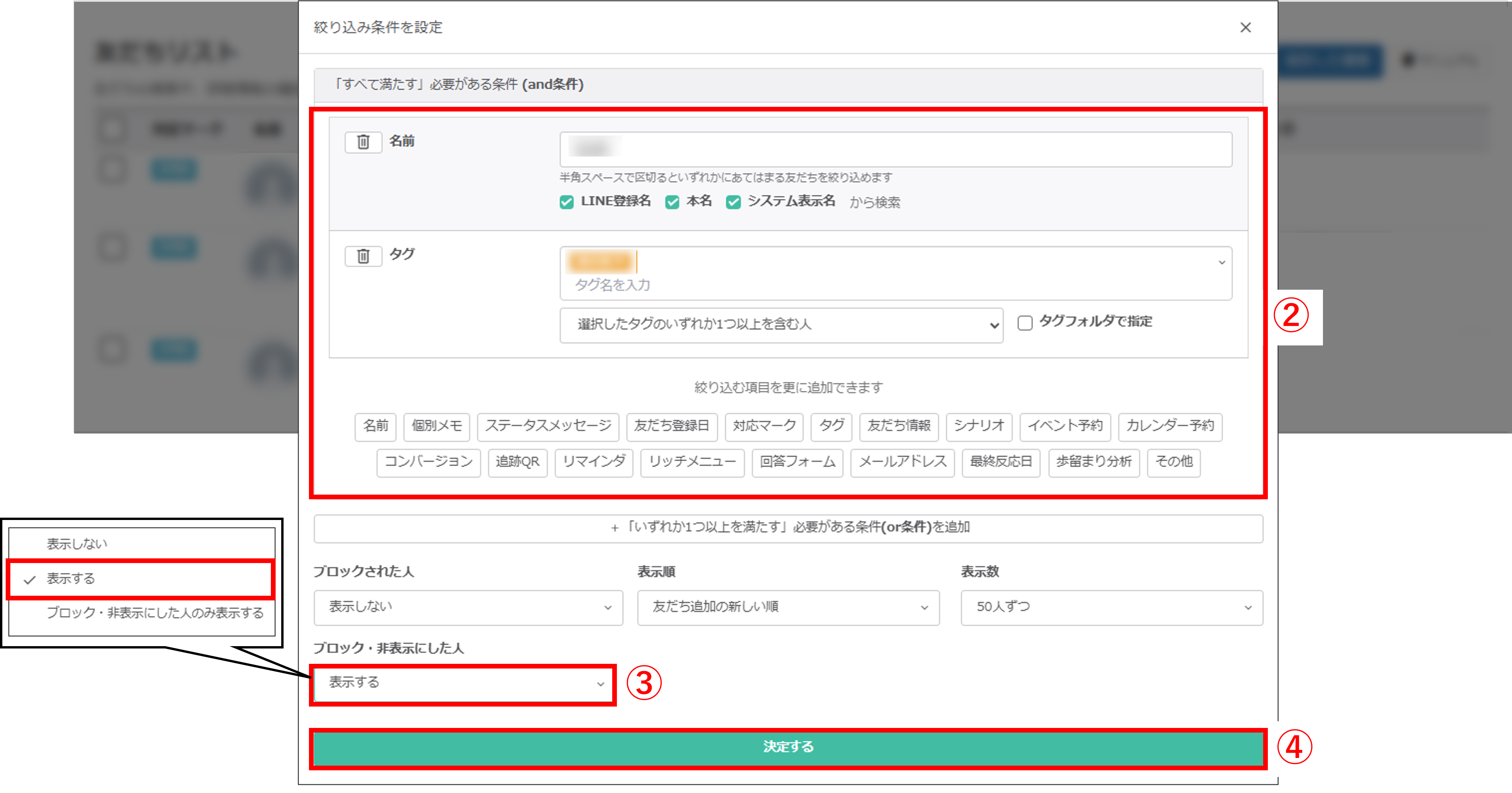 ②該当の友だちの名前やタグなどの検索条件を入力します。