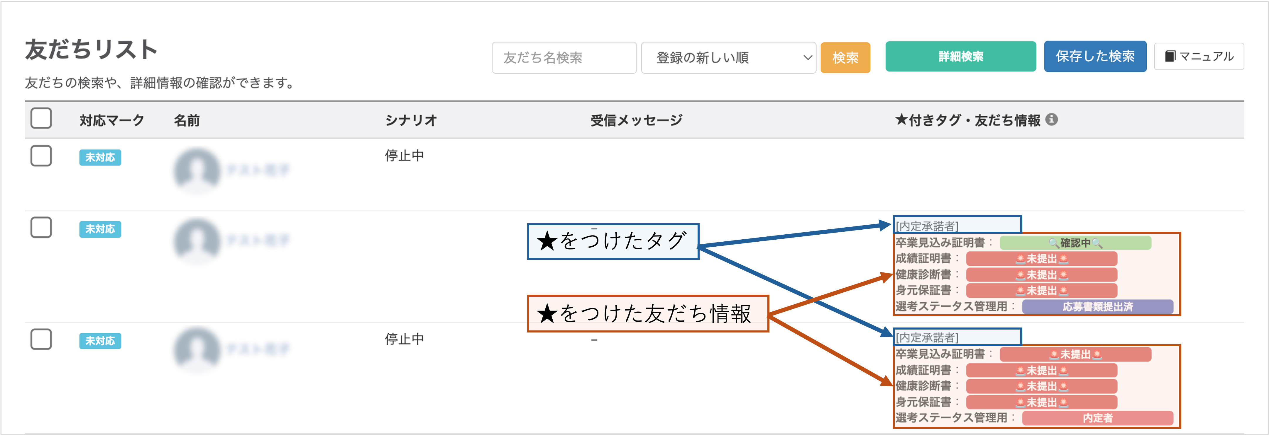 左メニュー>「友だち情報欄管理」>友だち情報欄一覧画面で★をつけることができます。
