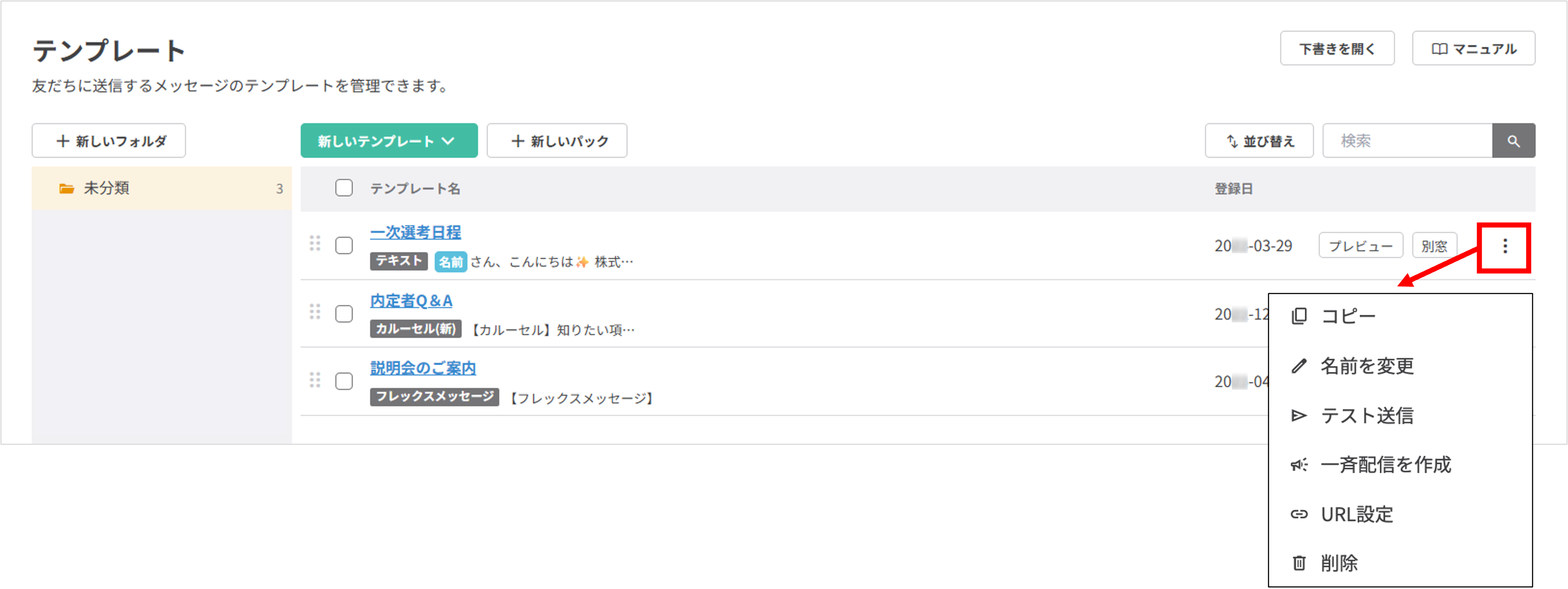 ③〔+新しいパック〕ボタン:テンプレートパックを作成できます。テンプレートパックを使うと、複数のメッセージを1通の消費で送信できます。
