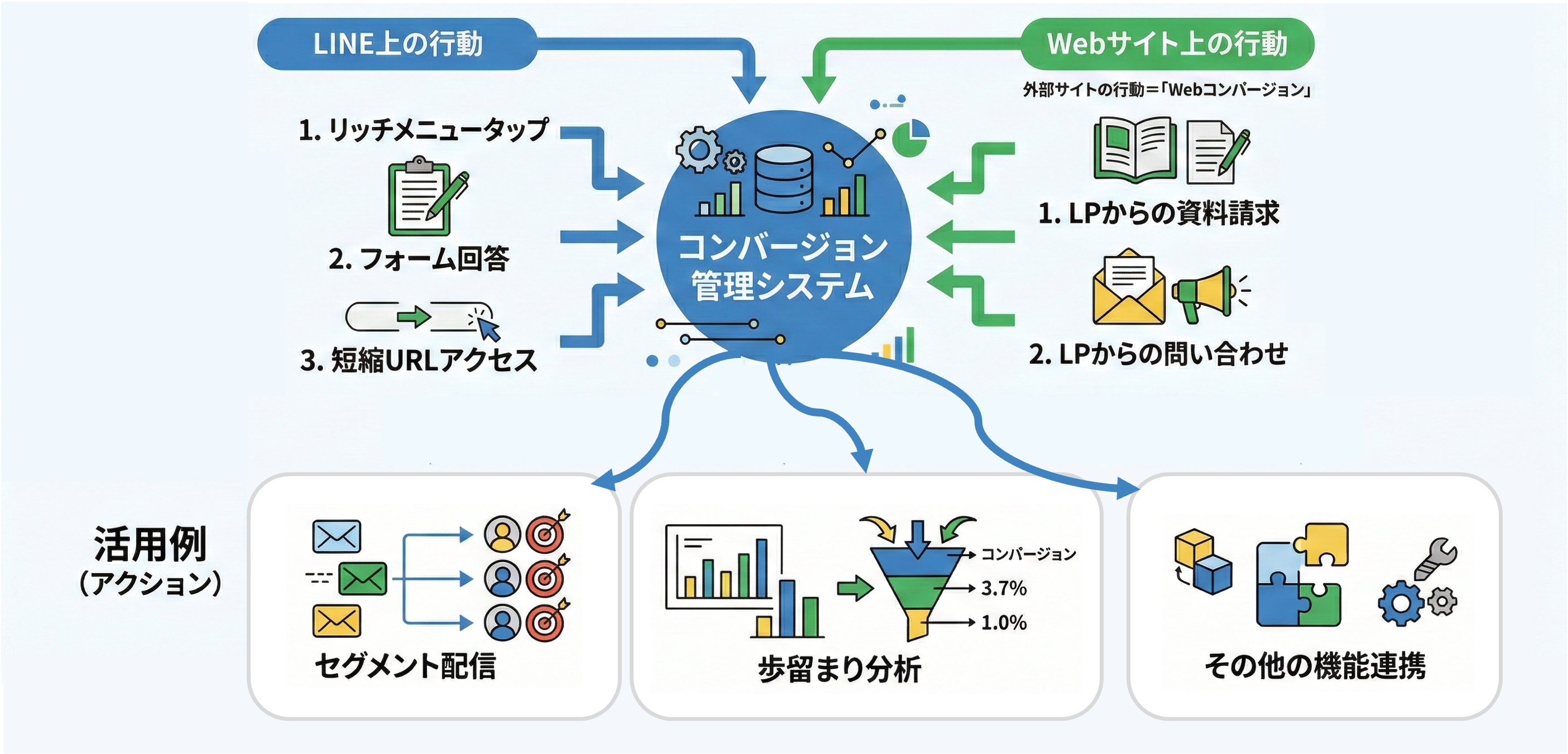 LINEの行動を計測:リッチメニュータップ、フォーム回答、短縮URLアクセスなどで活用できます。