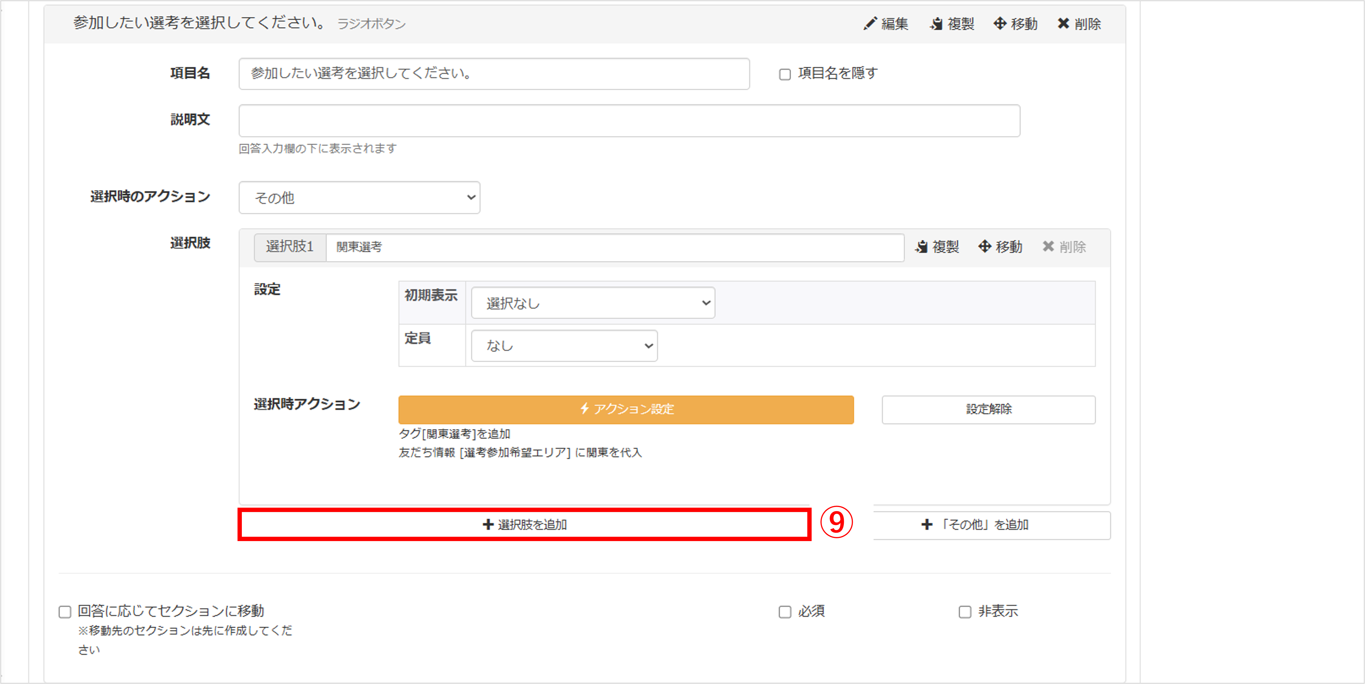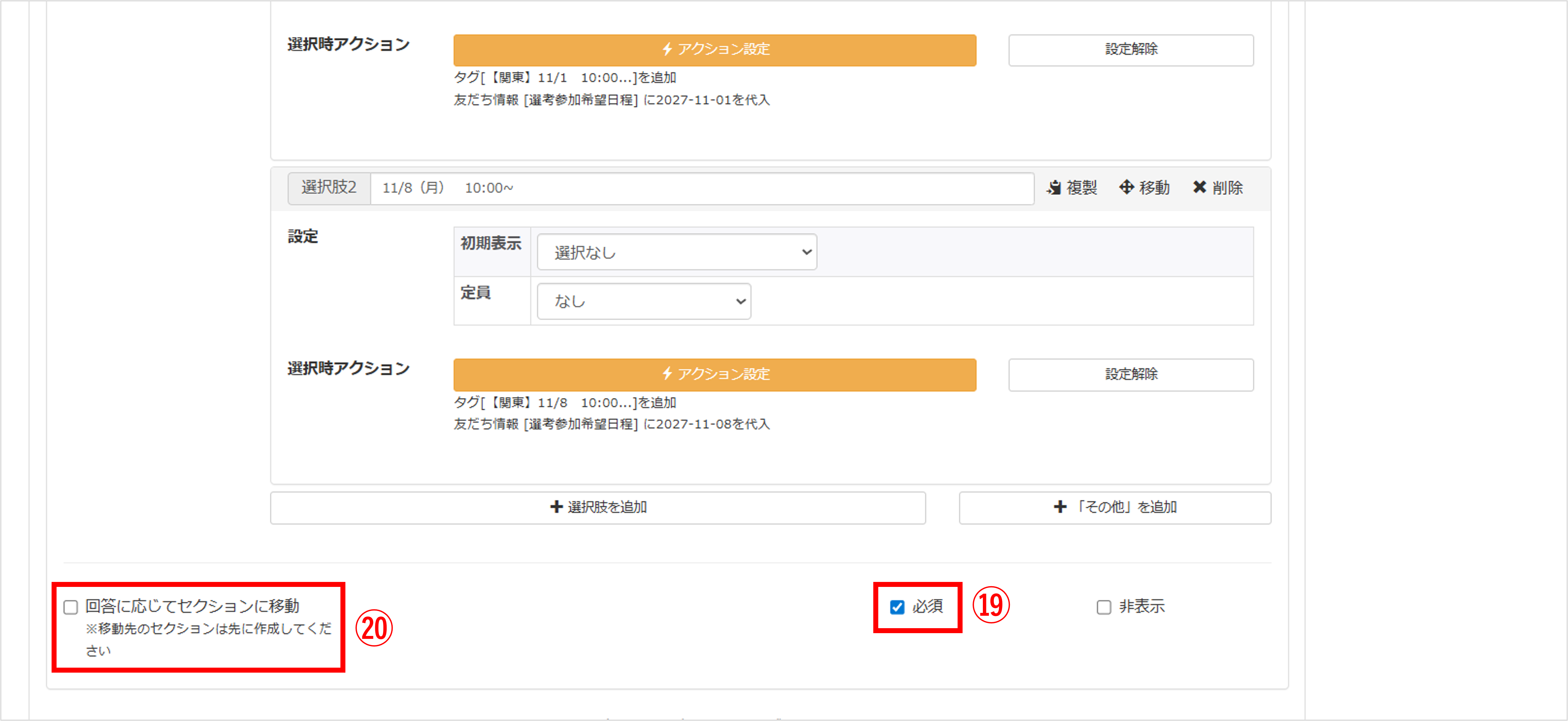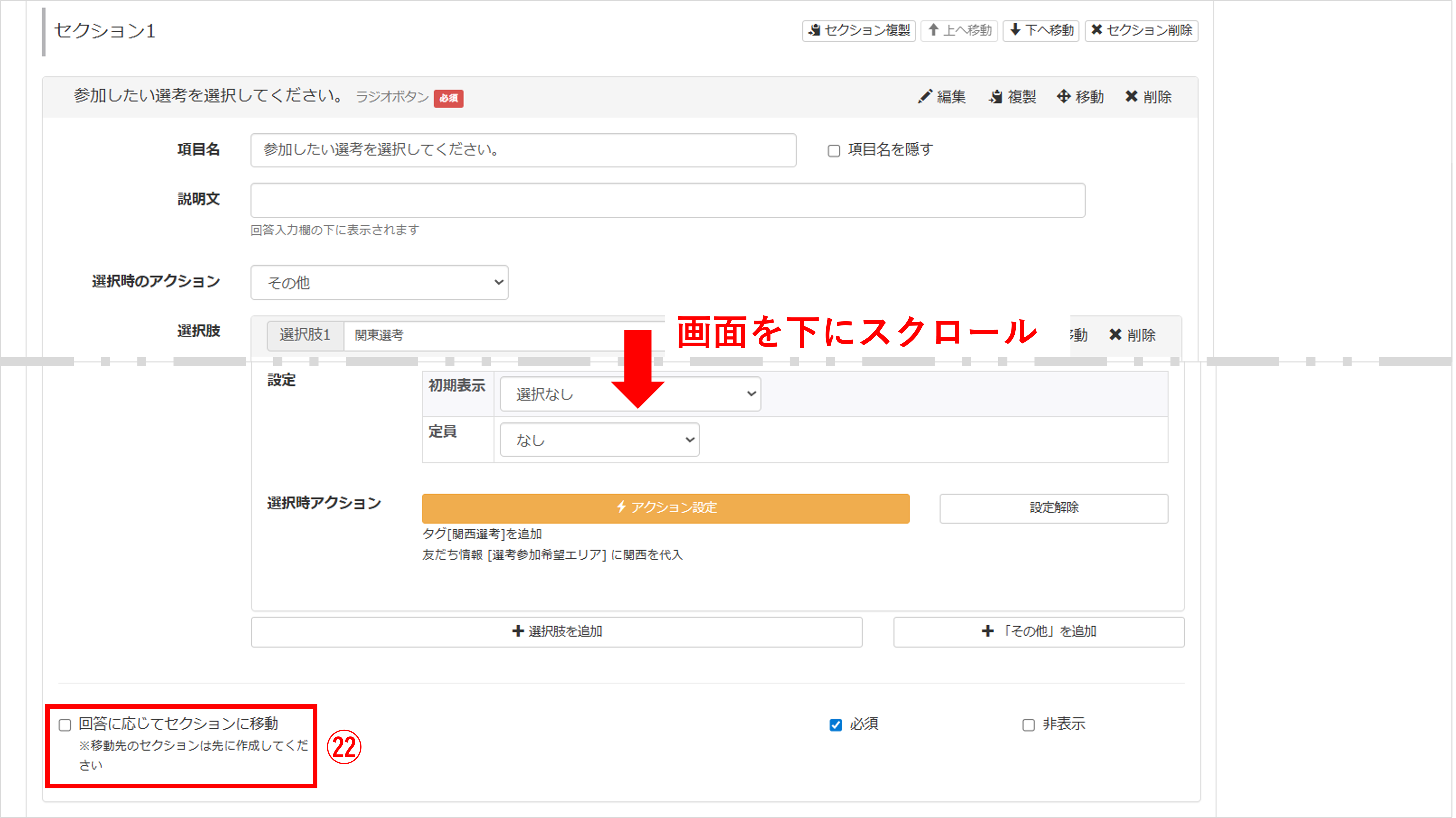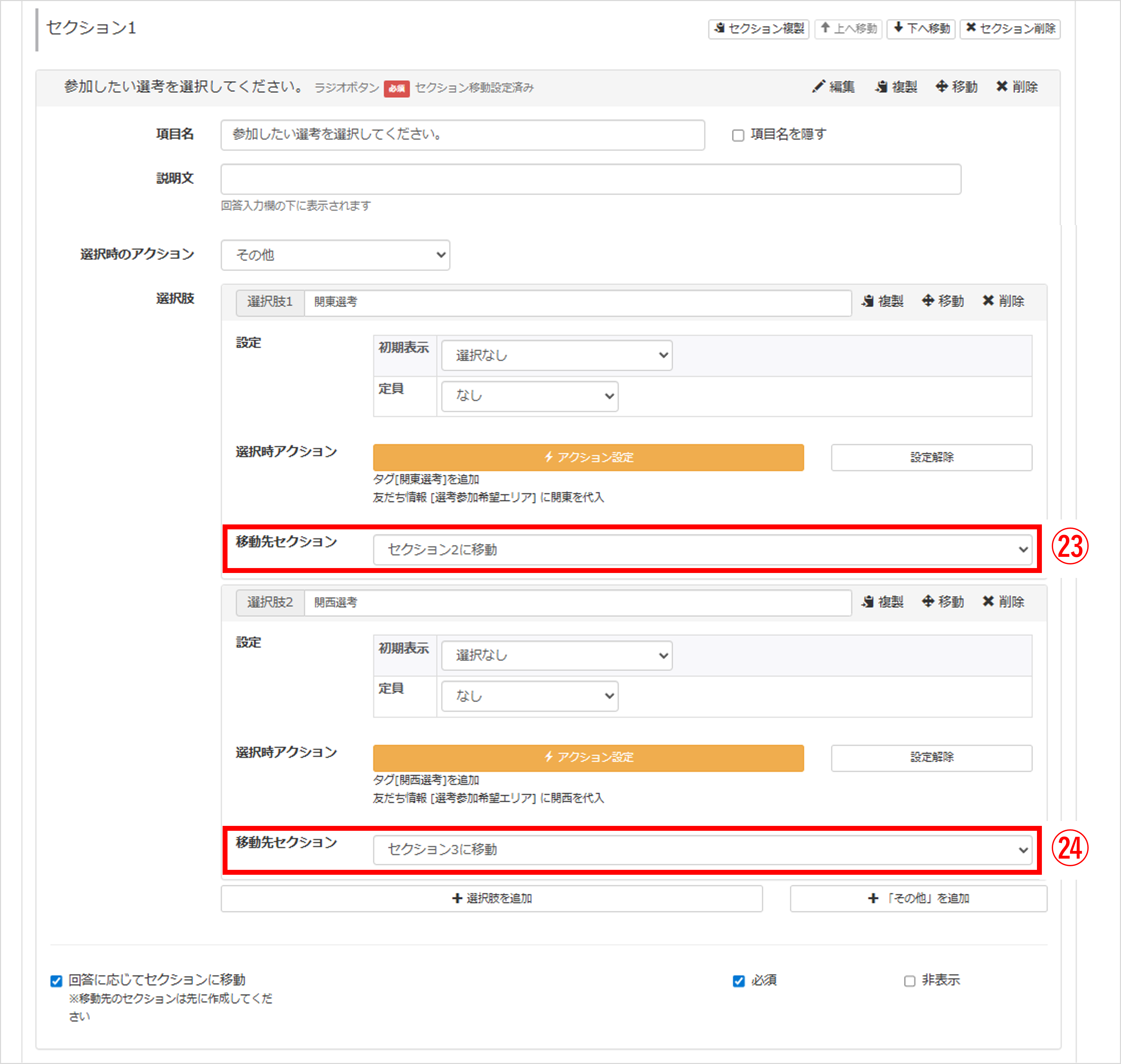★同一セクション内で分岐機能を設定できるのは1つのみです。