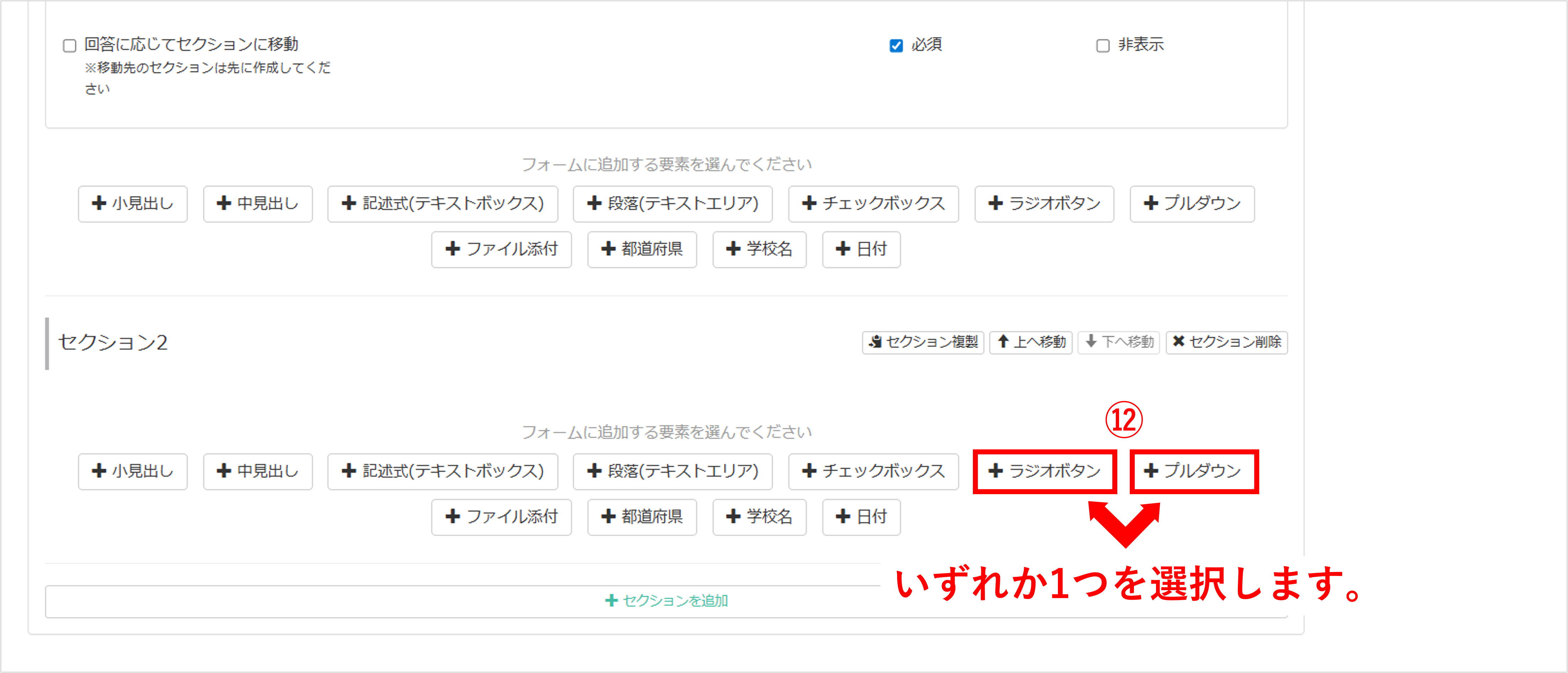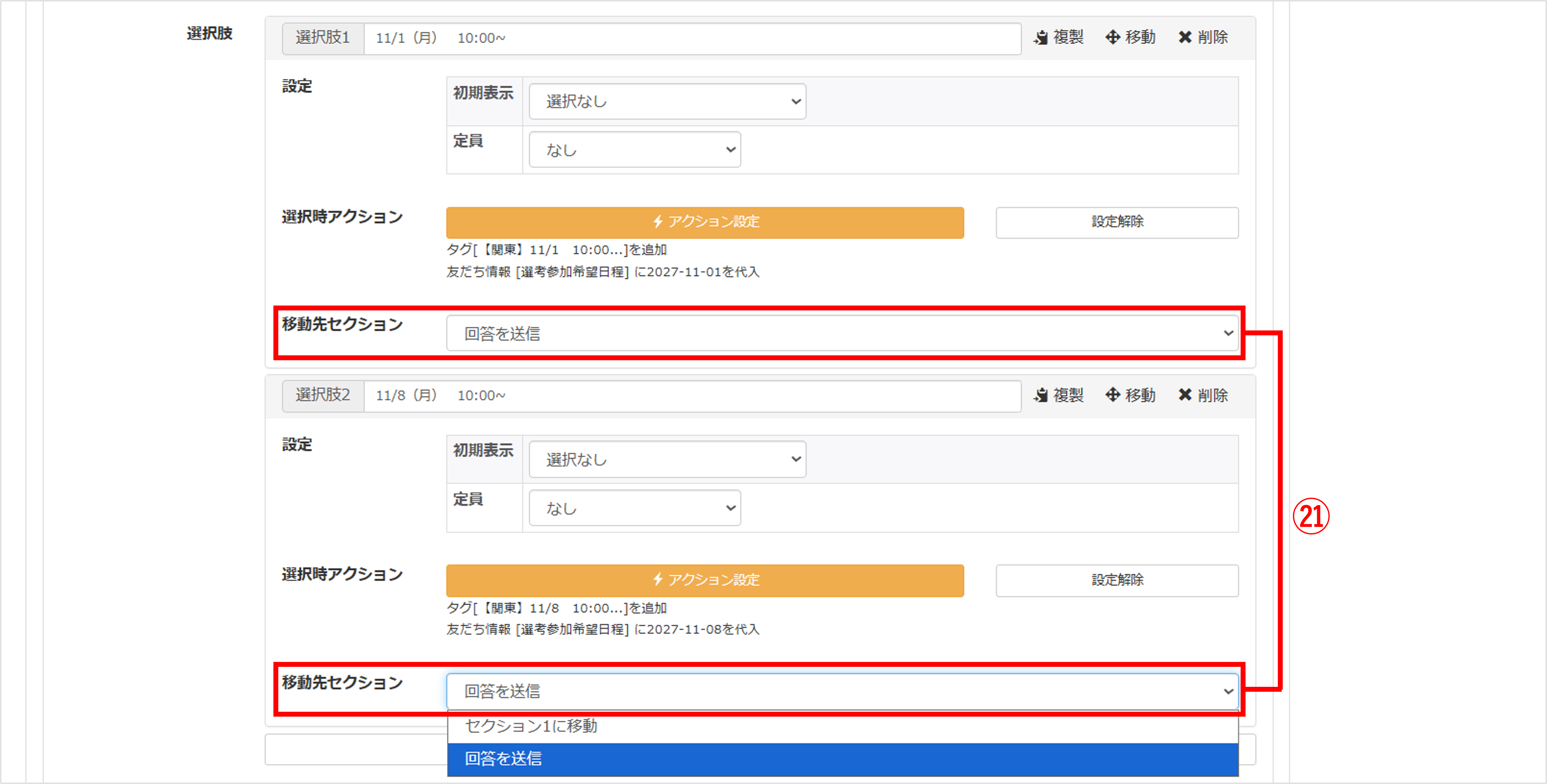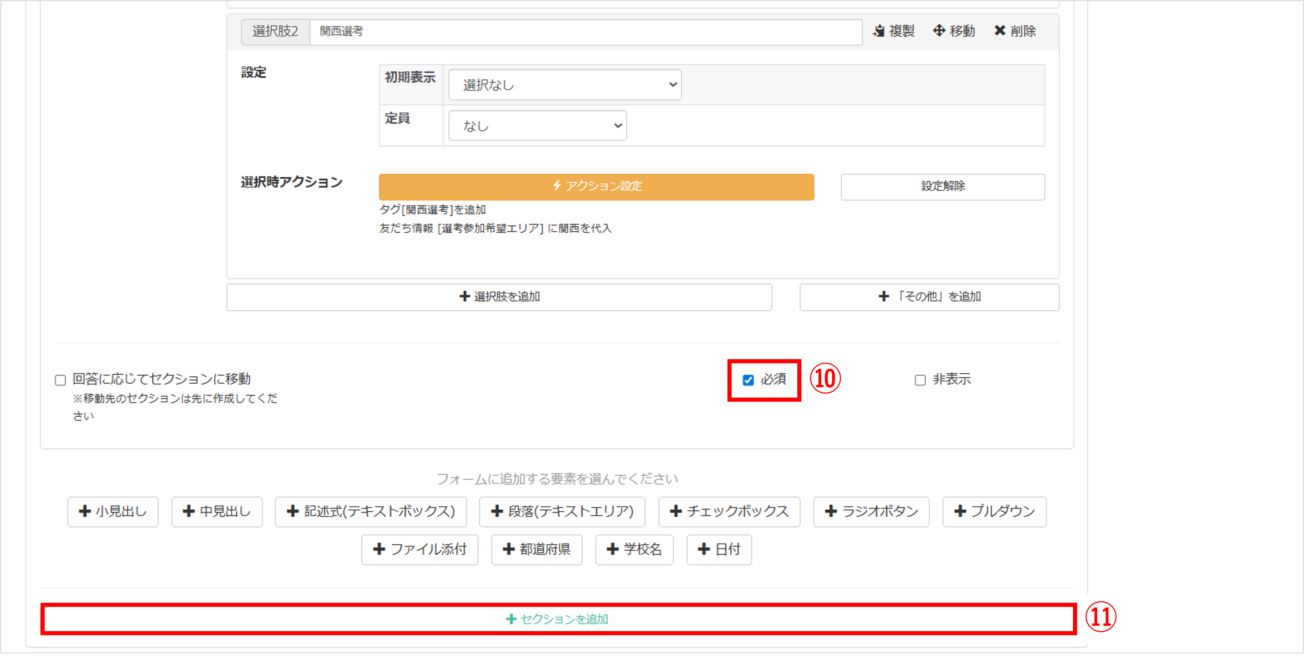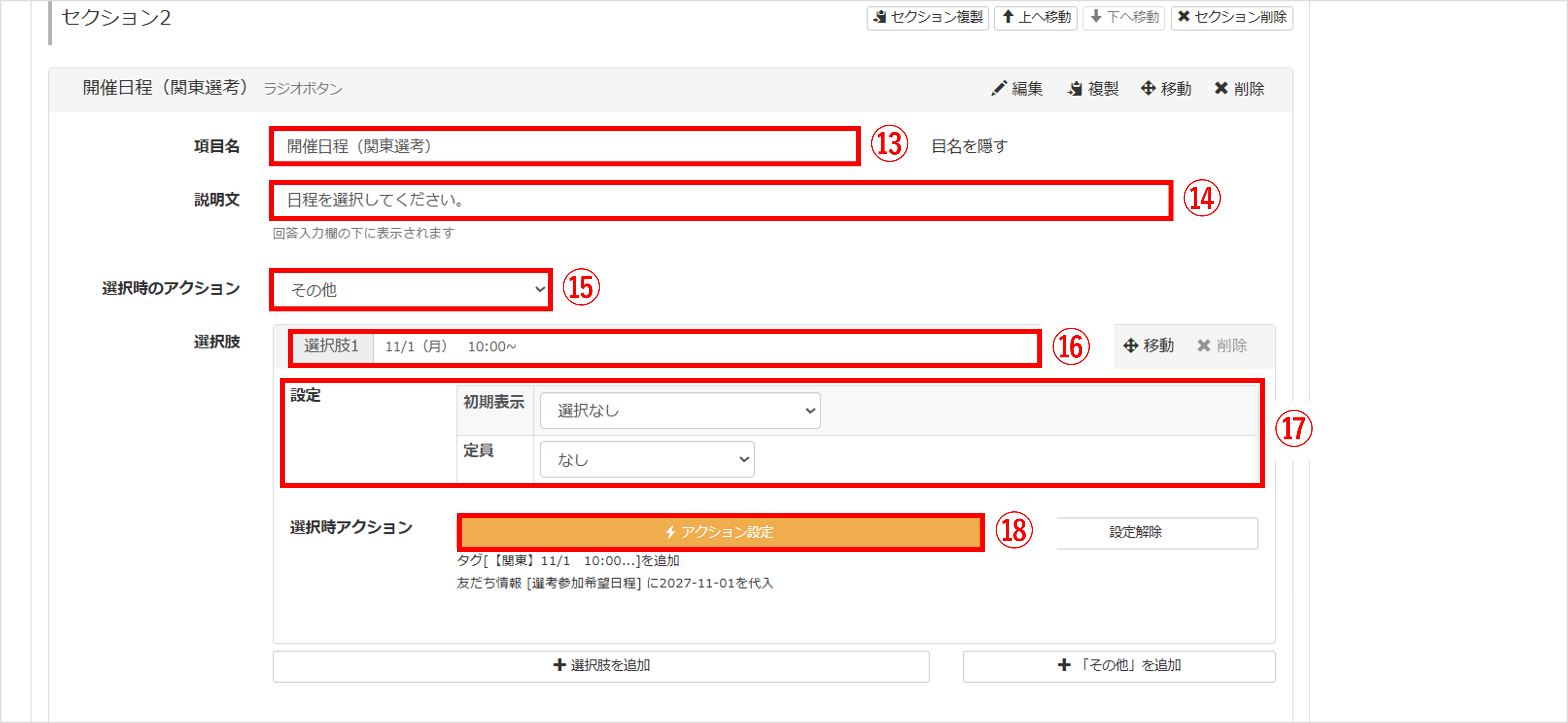 ★同一セクション内で分岐機能を設定できるのは1つのみです。
