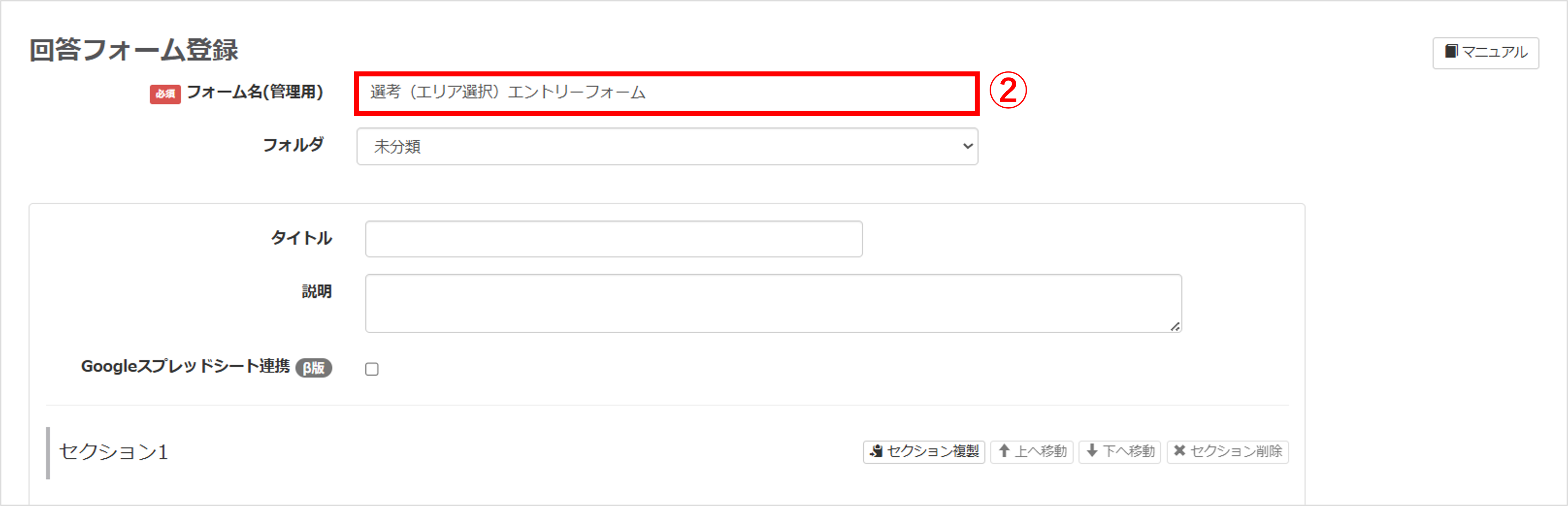 ②『フォーム名(管理用)』を入力します。必要に応じて『タイトル』や『説明』を入力します。