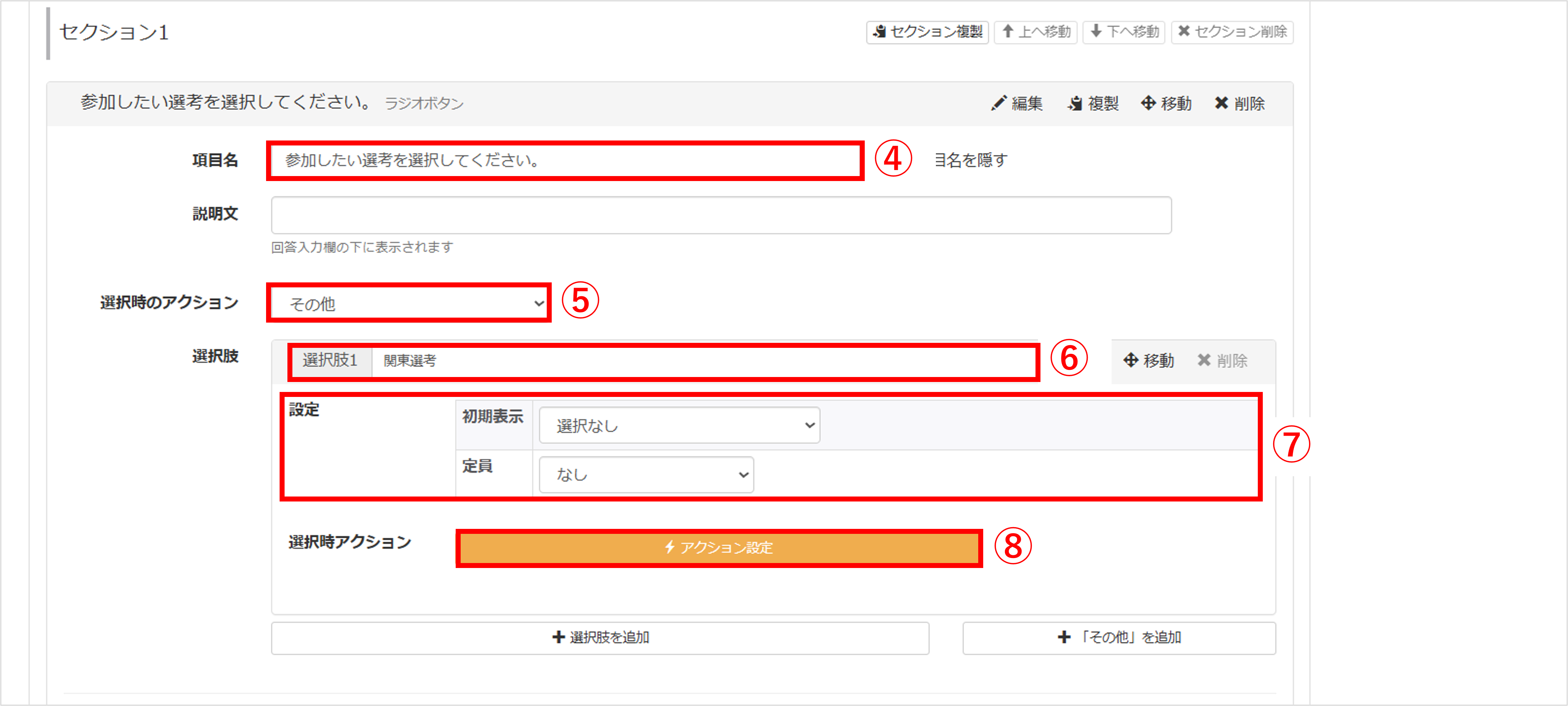 ・定員:この選択肢を選択できる人数の上限を設定できます。