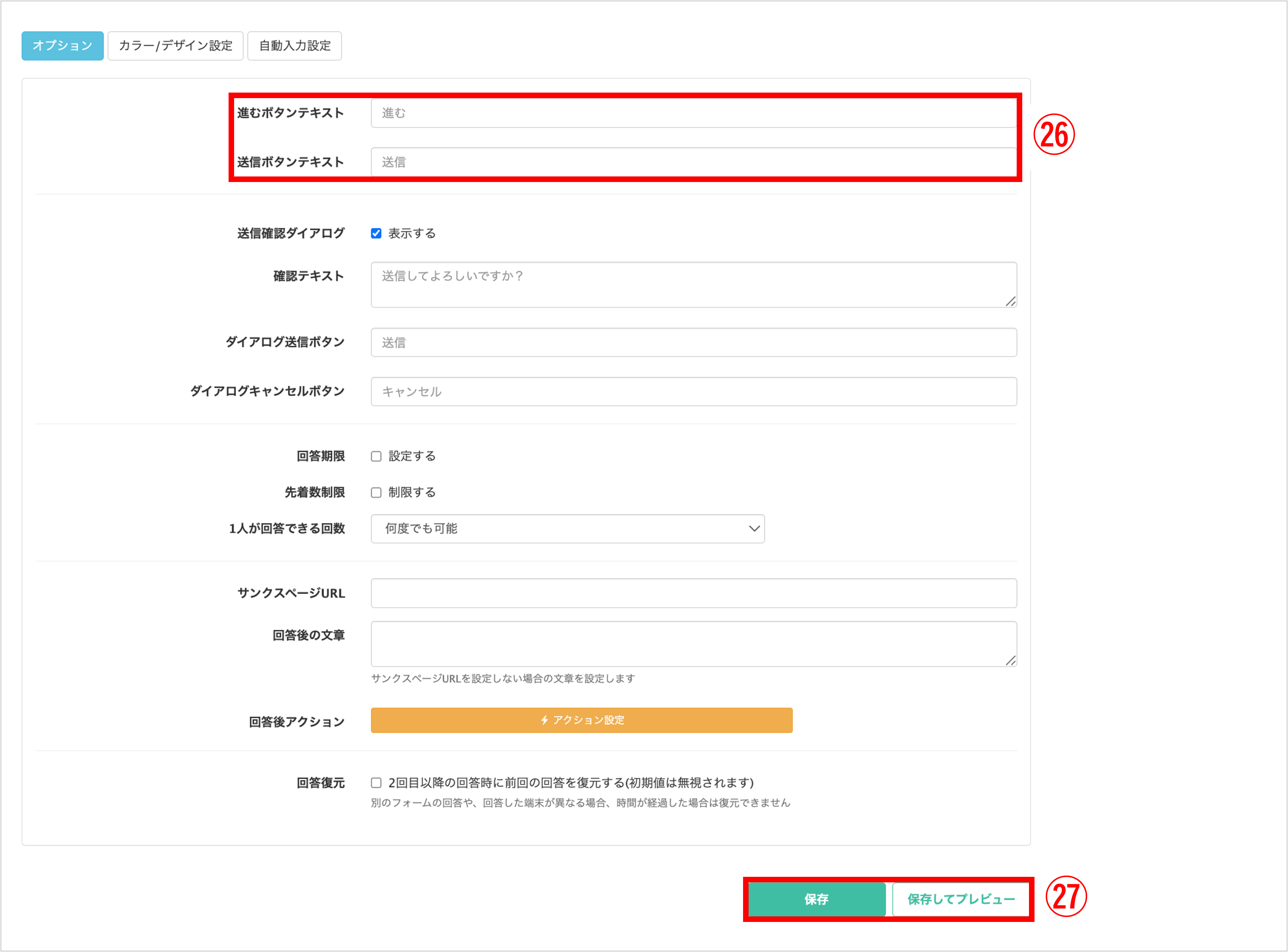※セクションごとに「進む」ボタンの文言を切り替えることはできません。